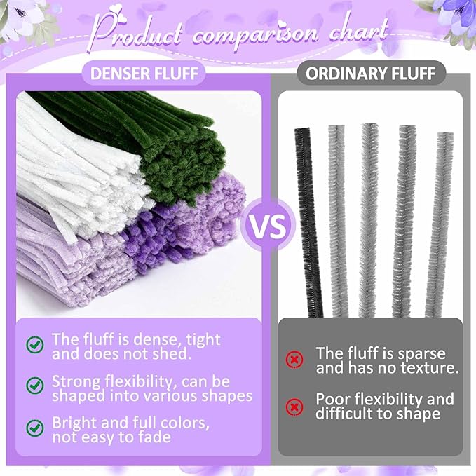 - Operational Across Multiple Platforms: be it projects, DIY crafts, decorative endeavors, or even as nice gifts, these purple pipe cleaners find their purpose in a plethora of applications; Its versatility, coupled with its vibrant colors and durability, makes it a nice tool for your art workshops, home decor crafts, or even as cute embellishments to gifts and presents