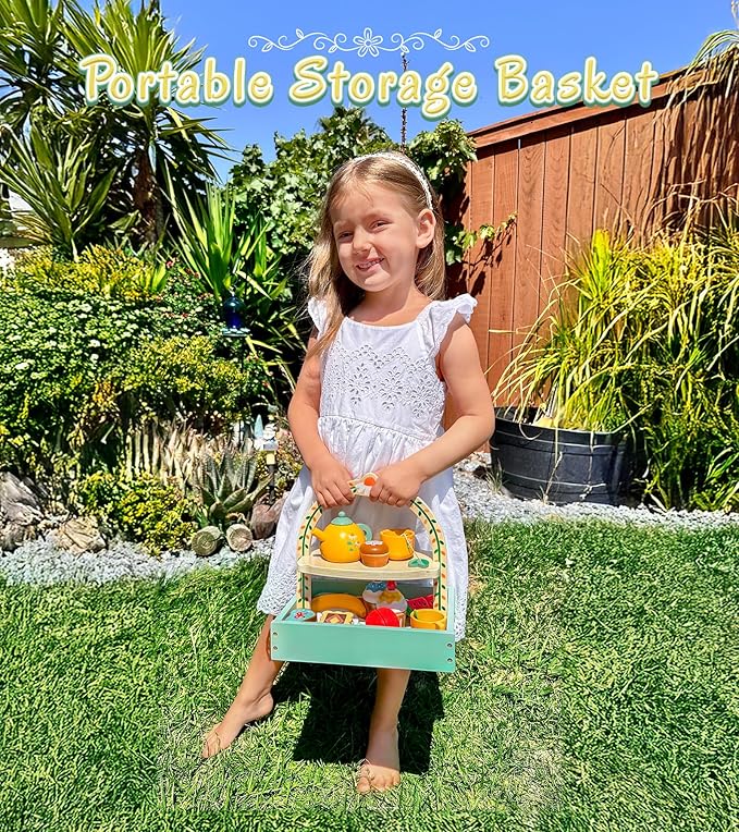 - Delicate Gift for 3 4 5 Year Old Girls and Boys: Wooden tea party set include a teapot, two tea cups, two spoons, three saucers, two cupcakes, two tea bags, one muffin with sprinkles, one heart cake, one sandwich cookie, one watermelon, one banana, and one strawberry toy into a basket. Variety of components really allows for an immersive tea party experience. Ideal gift for girls on birthdays, Christmas