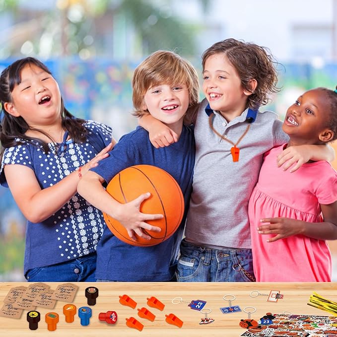 - Large Quantity Basketball Party Favors: You will receive 170 pieces of basketball party favors including 12 pcs cups with dome lids, 12 pcs basketball straws, 12 pcs basketball whistles, 12 pcs basketball key chains, 12 pcs mini basketball, 12 pcs basketball rubber bracelets, 12 pcs slap bracelets, 12 pcs basketball stamps, 12 pcs thank you tags, 12 pcs twist ties, 50 pcs basketball themed stickers, enough quantity and styles for your basketball birthday party favor, meet your daily use