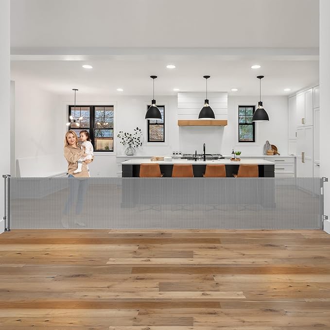 - 185-inch Extra-Wide Coverage: This retractable baby gate extends up to 185 inches, making it perfect for securing large indoor and outdoor openings. Whether it's doorways, hallways, garages, decks, or more, this retractable mesh gate works effectively as both a barrier and room divider.