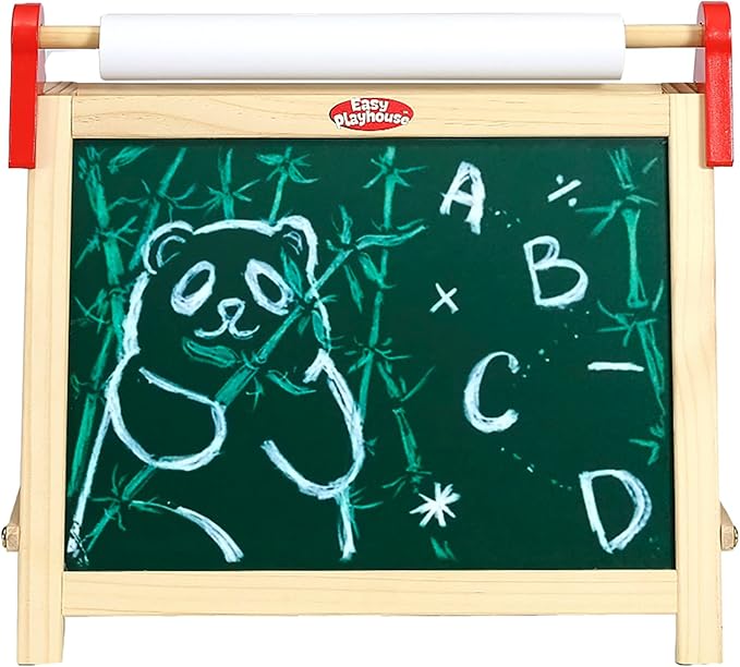 Easy Playhouse Wooden Table Top Easel for Children. Double Sided, White Board and Chalk Board. Chalk, Eraser, Markers, Alphabet, Stickers and Paper Roll. Age 3+