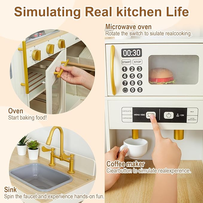 - Plenty of Play Features: This kids kitchen playset includes a range of captivating features, such as a stove and range hood with lights and sounds, a refrigerator, an ice maker, a microwave, an oven, a coffee maker, a sink, and categorized storage baskets. It also comes with 14 pcs colorful accessories to inspire endless imagination. The knobs make a "click-clack" sound, providing tactile and auditory feedback, while the ice maker pretends to dispense ice cubes.