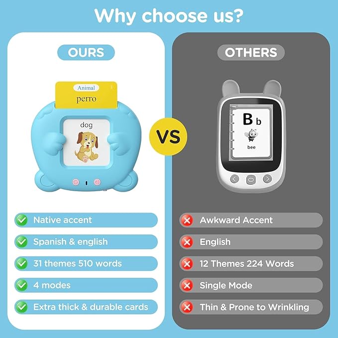 - 【Spanish & English Talking Flash Cards】The upgraded version allows for easy switching between English, Spanish, and bilingual modes. It includes 255 flash cards with 510 sight words across 31 themes, such as letters, colors, animals, and vehicles. The adorable koala design, combined with standard pronunciation and colorful images, attracts children's interest, helping them learn new words, build vocabulary, and explore different possibilities.
