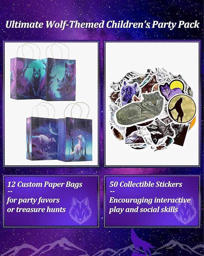 - 【Essential Wolf Birthday Party Decorations】Comprising 12 wolf-design storage bags, 12 balloons with strings, 12 distinctive wolf keychains, 12 wolf-inspired clapping wristbands , and a pack of 50 wolf stickers. The ample and artfully wolf gifts ensure a memorable and adventurous celebration.