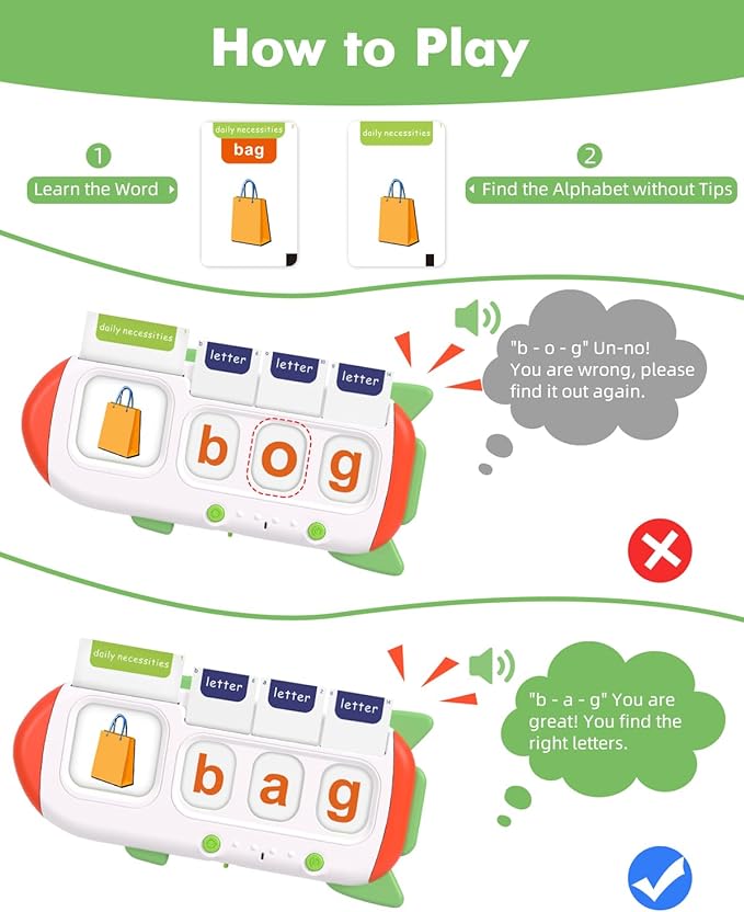 - Fun Interactive Learning: Designed for simplicity and ease of use it independently. When insert a card, it reads the word and says: "Please find the spelling letters". Insert the right letters, you'll hear “You're great! You found the right letters", if you insert the wrong letters, it will encourages you to try again. This speak-spell method helps children remember words more quickly, real-time sound feedback making the learning process more engaging