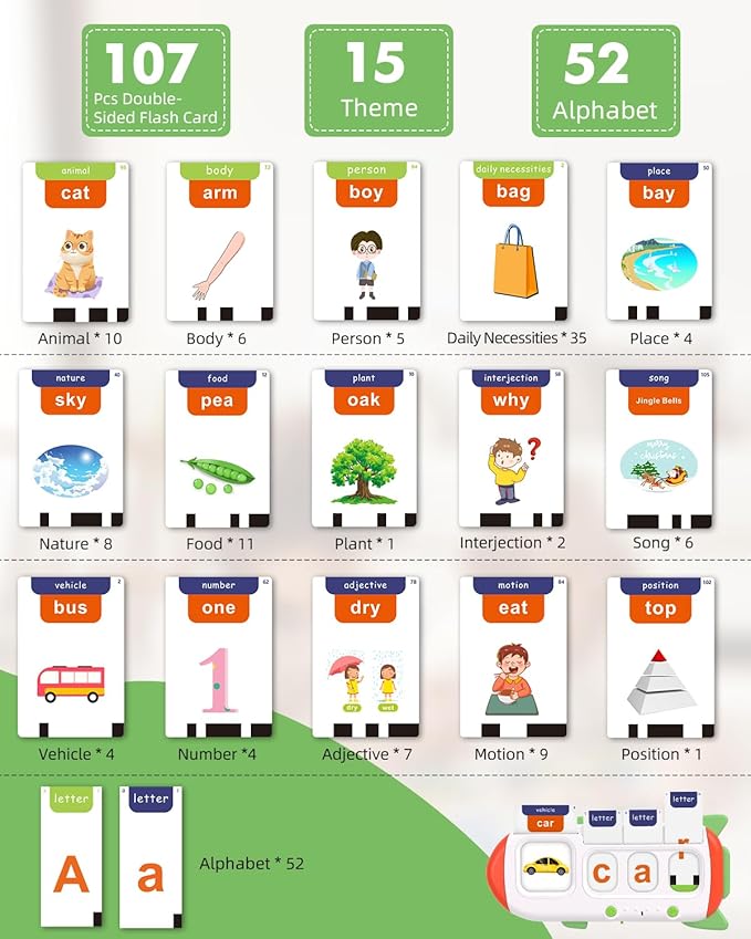 - Interactive Learning: This rocket-shaped talking flash card reader comes with 107 sight word cards, 52 letter cards and 3 music cards (each music cards has 2 classic nursery rhymes on it, total 6 songs), covering daily necessity, vehicle, food, animal, number, people, plant, nature, etc. This device not only boosts fundamental cognitive skills but also enhances memory through engaging interactions,guiding children through spelling verification effortlessly