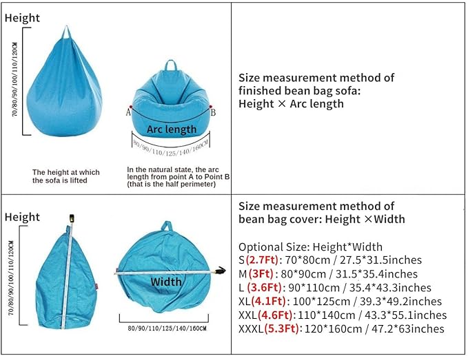 - 【About Size】 The size of our inner liner cover for bean bag sofa varies from 2.7 Feet to 5.3 Feet, suitable for both kids, teens and adults. 2.7 Foot=70*80CM, 3 Feet=80*90CM, 3.6 Feet=90*110CM, 4.1 Feet=100*125CM, 4.6 Feet=110*140CM , 5.3 Feet=120*160CM. (Package only contains a bean bag cover, not included filling)