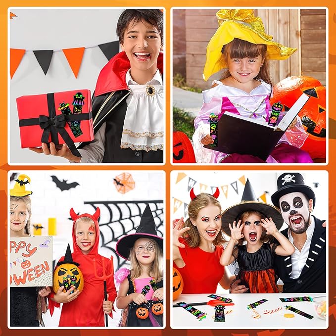 - Easy to Use: Halloween bookmarks comes with 12 bamboo sticks, which can easily scrape off the coating of Halloween scratch bookmarks and reveal hidden rainbow patterns, bringing you surprises and fun. Each rainbow scratch paper bookmark is equipped with a small hole at the top, which is convenient for you to hang the scratch bookmarks on bags, keys, gift bags, blackboards, windows, ceilings, trees and so on with colored ropes