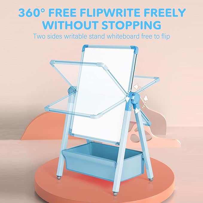 Art Easel for Kids, Double Sided Kids Easel Drawing Board, Whiteboard & Chalkboard for Kids, 360°Rotating Adjustable Kids Easel Art Set, Standing Erasable Easel Board, Easel for Classroom (Blue)