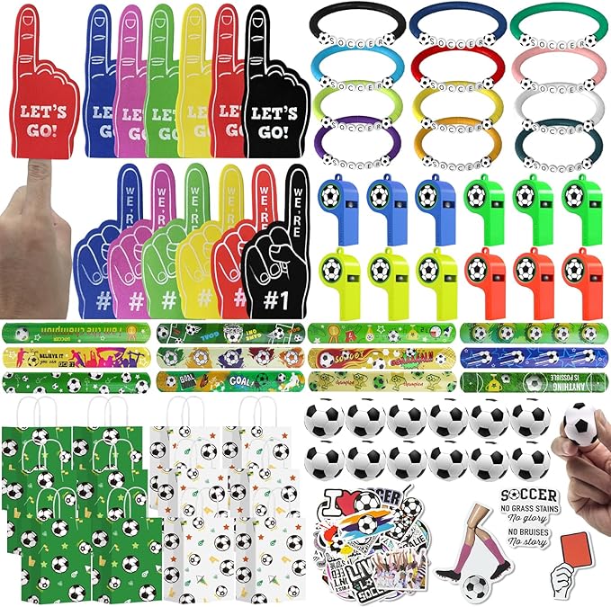 - You Will Receive 122 pcs Soccer Party Favors Set : including 7 different items: 12pcs silicone bracelet ,50 pcs soccer sticker ,12pcs soccer slap bracelet , 12pcs mini foam soccer, 12 pcs mini foam fingers, 12 football style whistles, 12pcs soccer gift bags