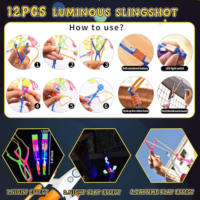 - What Will You Get :134 pcs space party favors includ 12 × Party bags 12 × Bracelet 12 × Keychains 12 × A slingshot that lights up 12 × Glow the dark stickers 12 × Rocket shaped flashlight 12 × Toy Planet 50 × Stickers These outer galaxy themes birthday party decorations will definitely meet all the expectations of children.