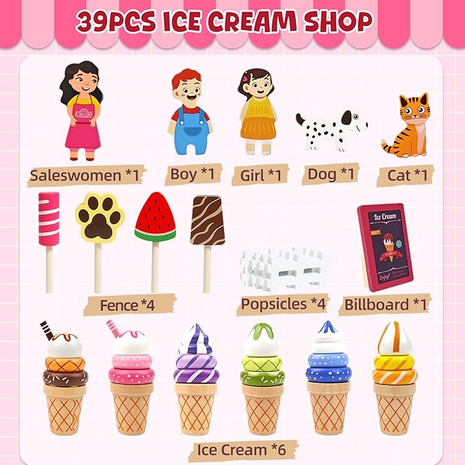 - 【Wonderful Accessories】Wooden play kitchen toys has a total of 39 pcs accessories, including6 flavors of ice cream (strawberry, blueberry, grape, chocolate, matcha, mango), 4 flavors of ice cream popsicles (watermelon, chocolate, strawberry, cream), a saleswoman, a little girl, a little boy, a cat, a puppy, an ice cream shop billboard, and 4 yard fences.