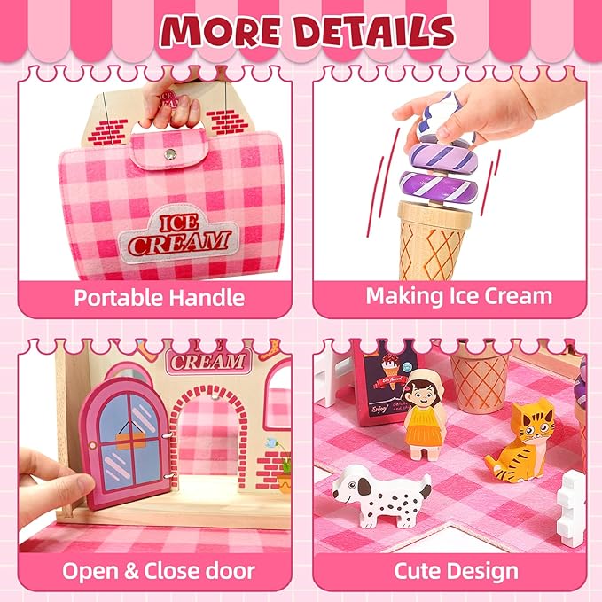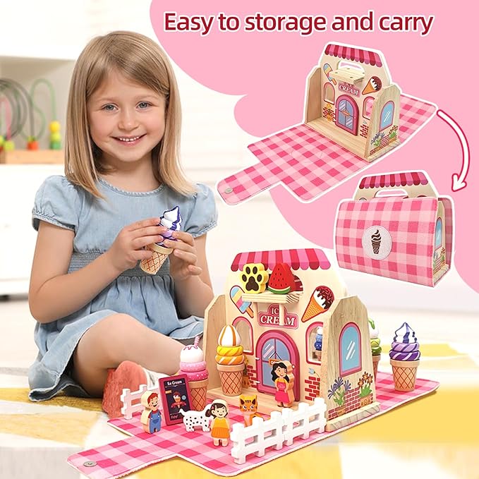 - 【2 in 1 Ice Cream Play Set】Wooden ice cream shop set is designed to be both entertaining and practical. When open, it transforms into a open-style ice cream shop, complete with all the accessories kids need to create their own pretend ice cream parlors. After the end, all accessories are stored together and folded into a carrying handbag. This feature makes it easy for kids to organize their toys and helps keep their rooms tidy.