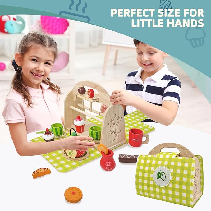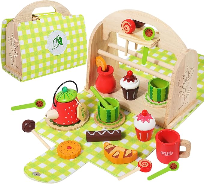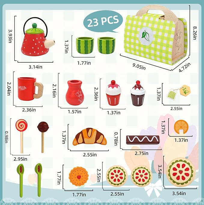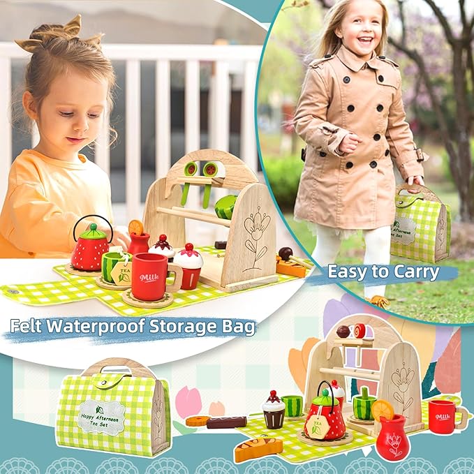 - 【2 in 1 Tea Party Set】This wooden afternoon tea set is both fun and practical. When opened, it provides a delightful experience for toddler 3 4 5 to enjoy a tea party. After the party, all the accessories can be stored together to become a handbag. This feature helps kids develop their organizational skills and keep their rooms tidy, adding endless enjoyment to both everyday activities and learning moments.