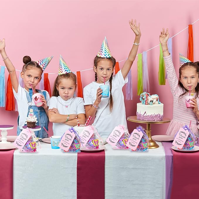 - Ample Butterfly Party Supplies: you will get 16 pieces of butterfly keychains, 16 pieces of butterfly bracelets party favors, 16 pieces of butterfly rings, 16 pieces of butterfly necklaces, 16 pieces of butterfly hair clips, 16 pieces of butterfly hair rings, 50 pieces butterfly stickers, 16 pieces of butterfly organza bags and 16 pieces of thank you tag cards, full of fairy themed elements, delicate and cute, ample quantity to meet your party needs