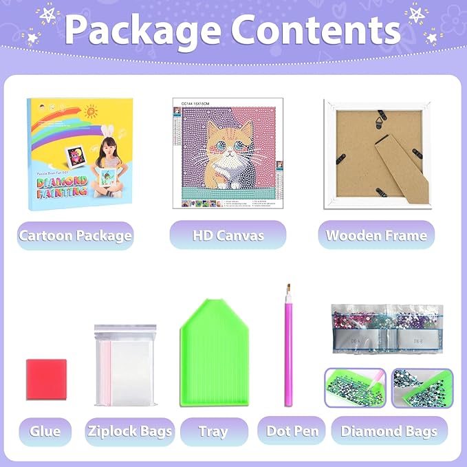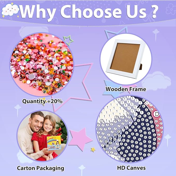 - Best Choice:Our Diamond Art Painting kits come with pre framed.The cute pictures and exquisite packaging are perfect for birthday and Christmas.You can put the finished product on the table or hang it on the wall at home,such as in the baby room,living room, etc.It will be a perfect home decoration full of success
