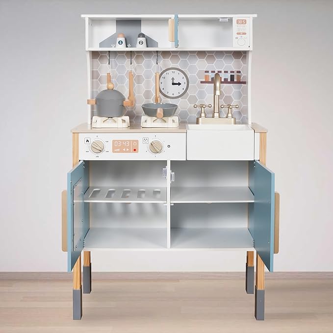 • ❥Toddler kitchen has enough storage space to cultivate children’s storage ability and develop a good habit of tidying things up. Perfect play kitchen for toddlers 3-8. The wooden toy encourages role-playing, problem-solving, and fosters a love for cooking and pretend play game