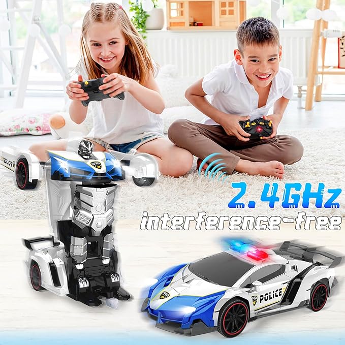 - One-Touch Transformation: Experience the thrill of transforming our RC police car into a robot with just one touch. Smooth transitions between modes add endless excitement