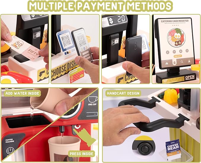 - Game kitchen set: This children's game kitchen set includes a variety of kitchen toys, food that changes color after cooking, simulated takeaway food packaging scenes, functional sinks with running water, ordering food and different payment games science that simulates life with cash, cell phone payment, bank card payment and many other payment methods and other accessories. Sticking matching stickers will make the whole suit more real.
