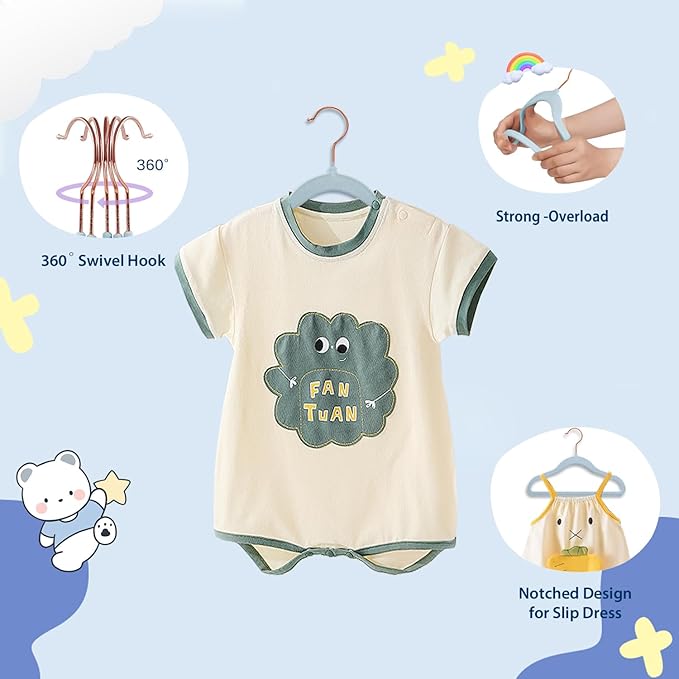 - FLOCKED VELVET FINISH - Fine soft velvett finish on the baby hangers, very soft finish to prevent your baby's clothes from scratches, also protect your baby's clothes from slipping off from hangers. 360° degrees swivel hooks allowing you to sort out your clothes from any angles in your closet easily.
