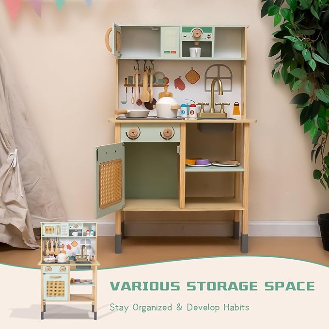 - VARIOUS STORAGE SPACE: The toddler kitchen has multiple shelving spaces, including the top shelf, hooks, and cabinets. Kids can place pots and pans in the right area, which not only keeps them neat and organized but also develops good storage habits