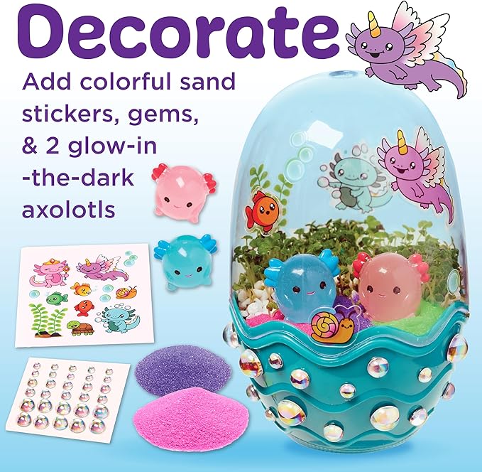 - ARTS AND CRAFTS FOR KIDS: Give the perfect axolotl gift for girls to kids who love science and hands-on activities! Everything you need to grow your own axolotl terrarium kit for kids is included! The DIY arts and crafts for kids 6+ includes potting mix, quick-growing chia seeds, stickers, mini axolotl toys, colored sand, and more