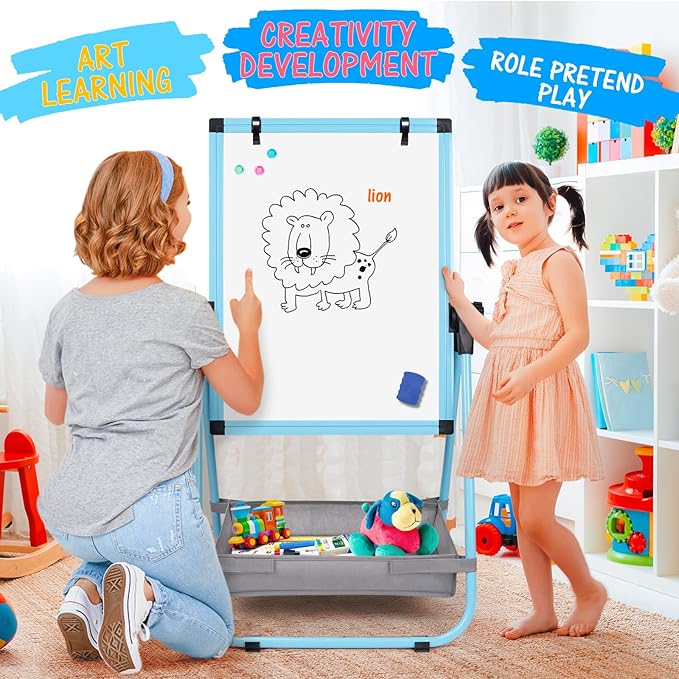 WEYOUNG Easel for Kids Easel for Toddlers, Adjustable Standingg Metal Toddler Easels Whiteboard & Chalkboard for Kids, Magnetic Art Easel for Kids Age 2-4 4-8 9-12, Blue
