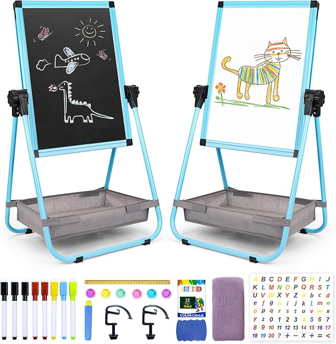 WEYOUNG Easel for Kids Easel for Toddlers, Adjustable Standingg Metal Toddler Easels Whiteboard & Chalkboard for Kids, Magnetic Art Easel for Kids Age 2-4 4-8 9-12, Blue