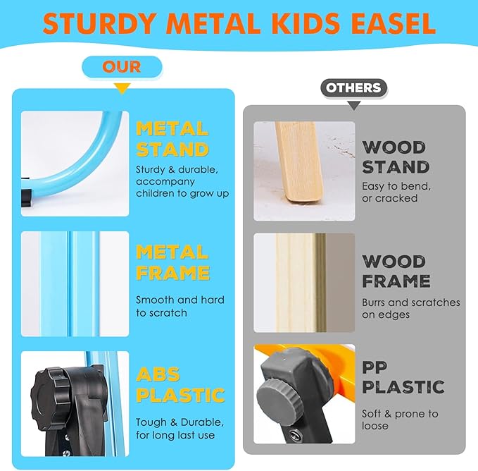 - Sturdy & Safe: The art easel for toddlers is made of premium metal and strong plastic, is longer-lasting than wood easels, and can withstand years of play. All surfaces and edges are smooth and have no burrs like wood ones, safe for long-time use