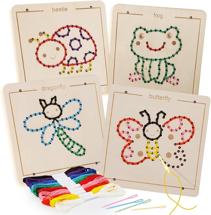 - Montessori Toys: Featuring 4 unique wooden lacing templates, 10 vibrant colors of yarn, and 4 plastic threading needles, offering a rich hands-on exploration and creative experience. As toddlers thread the colorful strings through the holes in the wooden boards, they develop hand dexterity, finger strength, and hand-eye coordination. These skills are crucial for future tasks such as writing, buttoning clothes, and using utensils.