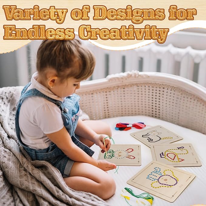 - Montessori Toys: Featuring 4 unique wooden lacing templates, 10 vibrant colors of yarn, and 4 plastic threading needles, offering a rich hands-on exploration and creative experience. As toddlers thread the colorful strings through the holes in the wooden boards, they develop hand dexterity, finger strength, and hand-eye coordination. These skills are crucial for future tasks such as writing, buttoning clothes, and using utensils.
