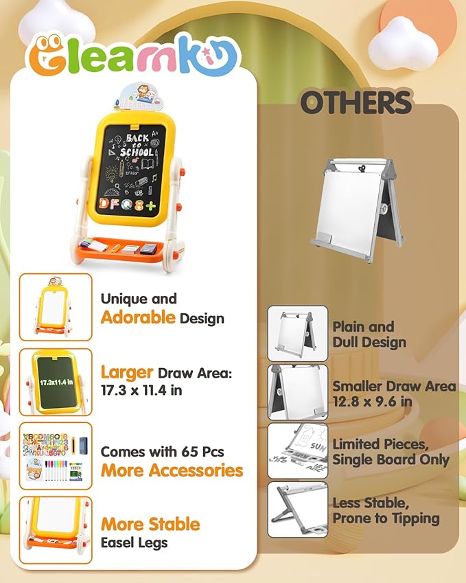 - Safe & Extra-Large Drawing Area: Gleamkid toddler writing board offers a spacious 17.3 x 11.4 inches drawing surface, larger than standard boards and rounded corners designed specifically for children's safety concerns. Made from non-toxic, robust PP and ABS materials, Gleamkid drawing easel is safe, sturdy, and long-lasting, ideal for little artists to freely create without limits