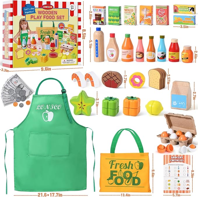 - ABUNDANT SUPERMARKET PLAYSET: This wooden supermarket toy set is designed to spark children's imagination and creativity as they set up their own shopping haven. Our comprehensive kits come with a variety of items such as shopping bags, aprons, menus, an array of produce like vegetables and fruits, beverages, meat like steaks, dairy products like eggs, bakery goods including bread and doughnuts, seafood like shrimp, food containers, play money and coins, and toy notes—all the essentials to bring the supermarket experience to life for kids