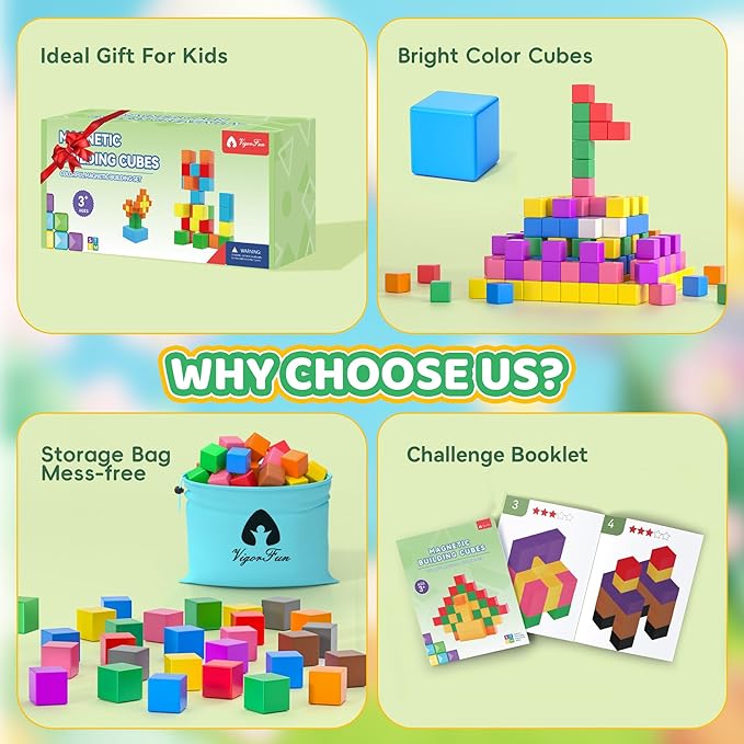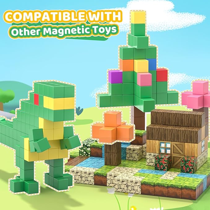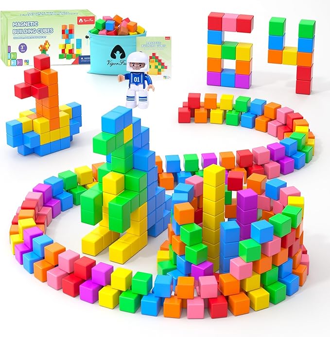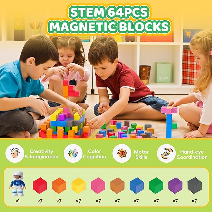 - 64 PCS Magnetic Building Blocks: This magnetic blocks set contains 63 pcs bright color magnetic blocks, a magnetic toy figurine, a manual and a storage bag. Made of reliable ABS material with a smooth and rounded surface, ensuring safe and worry-free play for children