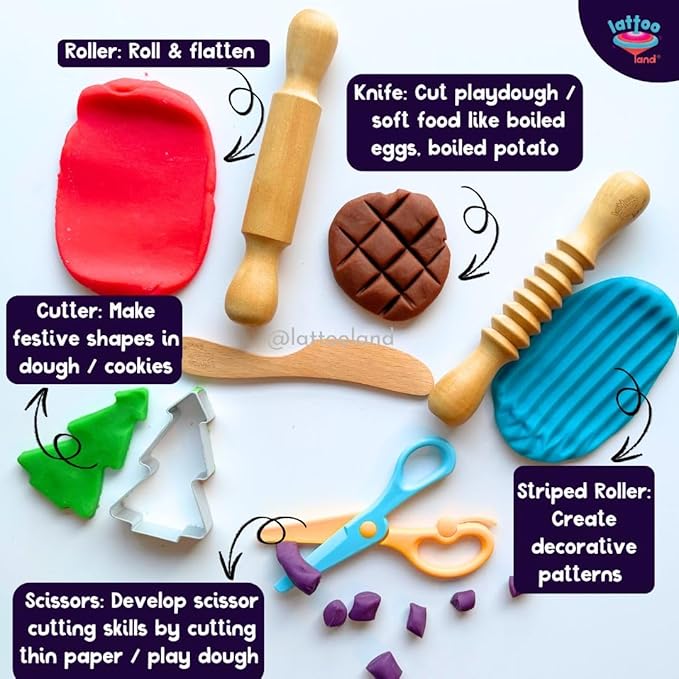 - Complete Play Dough Tool Set for Kids: Includes 2 types of child-sized wooden rolling pins/rollers, wooden knife, child-safe scissors, metal clay mold of tree shape for rolling, cutting, molding, and flattening—everything your child needs for endless creativity and fun.
