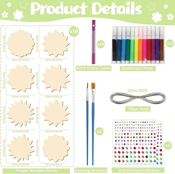 - DIY wind chime kit: Includes 16 pieces of lotus flower unfinished wooden wind chimes(available in 8 styles), 48 pieces of wind chime tubes in 4 colors, silver wire of 65.6ft/20m, 2 sheets of water diamond stickers, 2 paint brushes, a set of 12 color watercolor pens. With ample quantities and diverse styles, it's ideal for children's creative activities, enabling them to craft their own unique lotus flower wind chime.