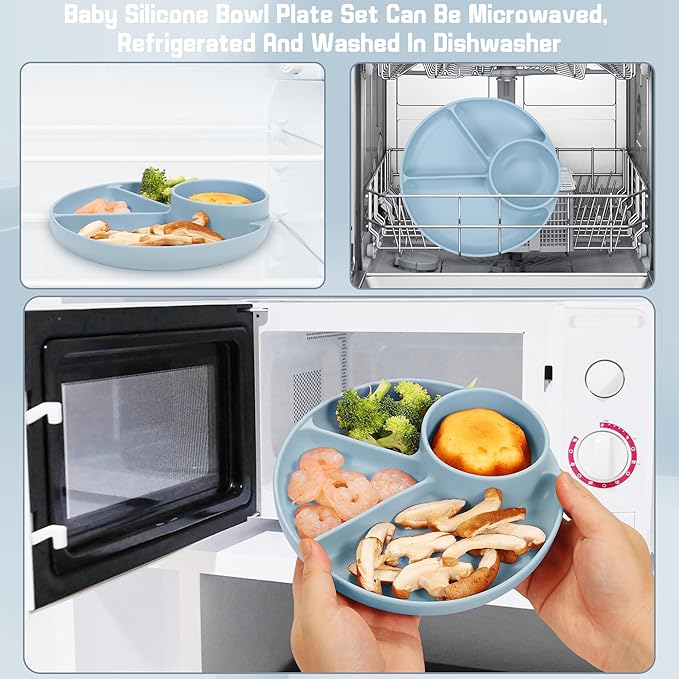 - Manage Baby Dish Set: The plate have suction points at their bases to help them stay secure on top of high chair trays, tables, and countertops. Effectively preventing your baby from throwing or tipping over the plate & bowl and making a mess