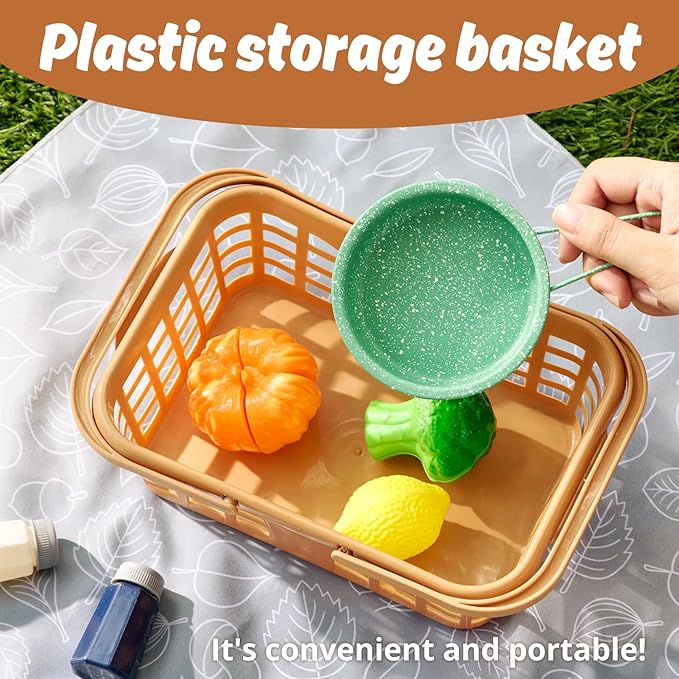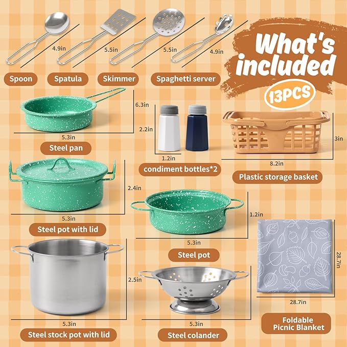 - πγ Kids Play Kitchen Accessories γβ 14PCS set includes: One colander, one stockpot, one pan and one low pot, comes with one covers, one spatula, one ladle, one draining spoon, one spaghetti server, one table mat and 2 spice bottles. There is also a carrying basket to store all the kitchen utensils.