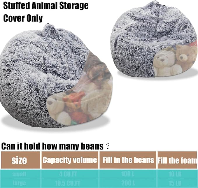 Fluffy Stuffed Animal Storage Bean Bag Chair Cover (No Filler), Faux Fur Comfy Bean Bag Cover for Organizing Plush Toys or Textile, for Adults Teens Kids Girls, Gray