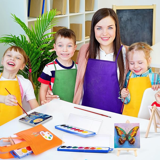 - Package includes: you will receive a mini watercolor paint set including 24 picture frames with easels, 24 long strip boxes of palette, 24 painting aprons and 24 canvas tote bags, 96 pieces in total; the sufficient quantity can meet your painting and learning needs