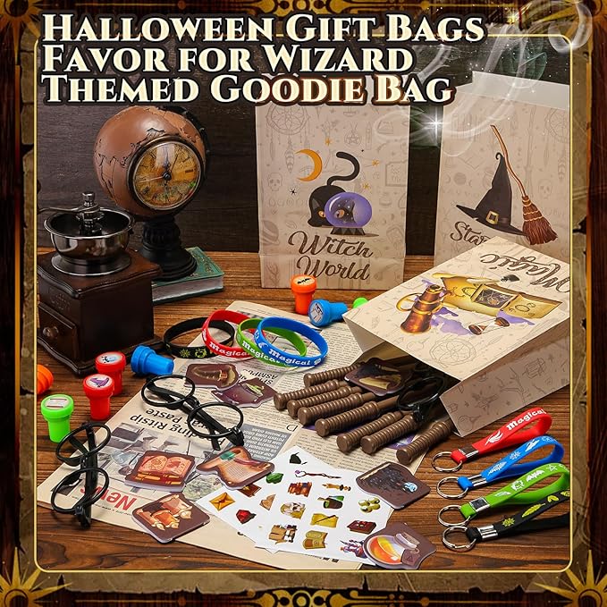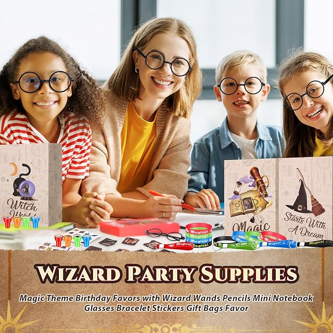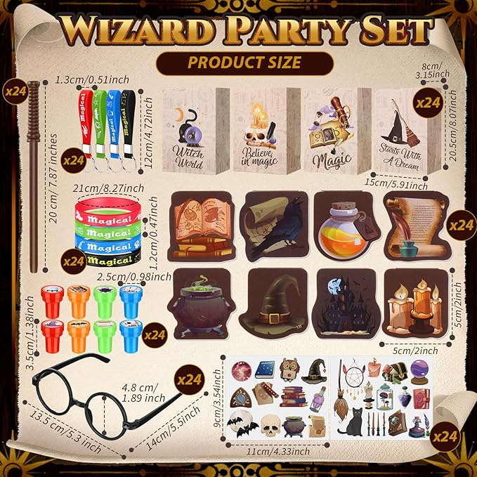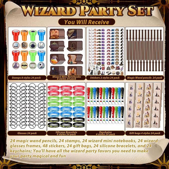 - Wizard Party Set: our package includes 24 magic wand pencils, 24 stamps, 24 wizard mini notebooks, 24 wizard glasses frames, 48 stickers, 24 gift bags, 24 silicone bracelets, and 24 keychains; You'll have all the wizard party favors you need to make your party magical and fun