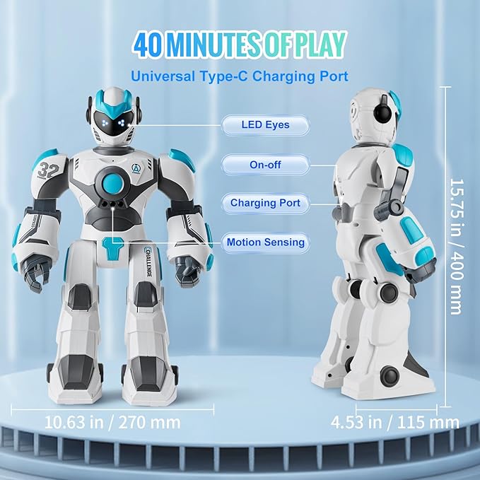 - ✅ Long-Lasting Fun: Our 2.4GHz robot toy runs on a built-in battery and charges easily with the included USB cable. Just plug it into any USB port, like a power bank, plug, or computer, for an energy-saving and convenient power-up.