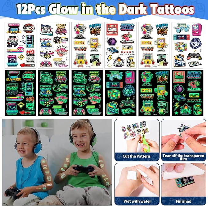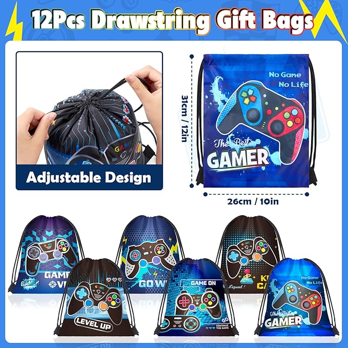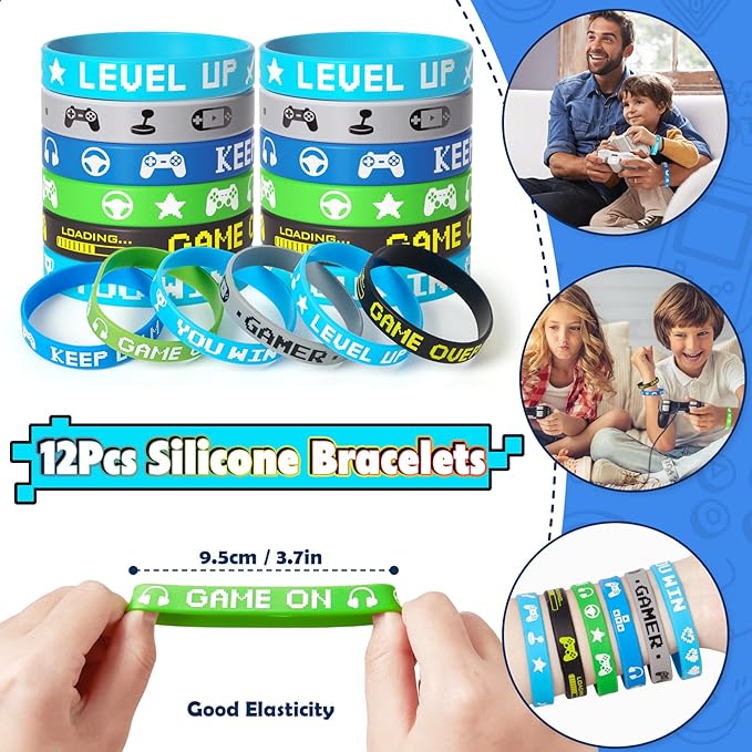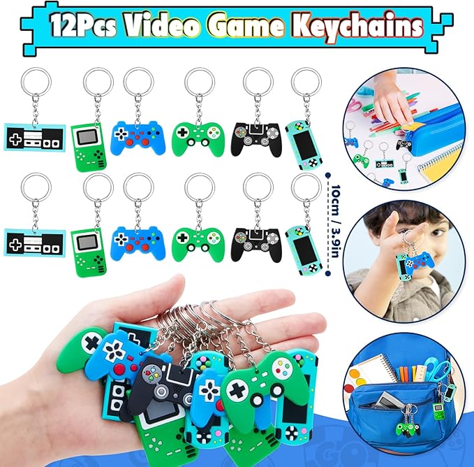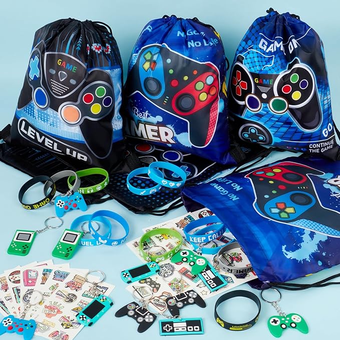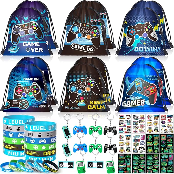 - Gamer Party Favors: The set includes 12 game-themed drawstring bags (6 styles), 12 gamer glow-in-the-dark tattoo stickers, 12 video game keychains (6 styles), and 12 silicone bracelets (6 styles). Kids will love this rich favor set.