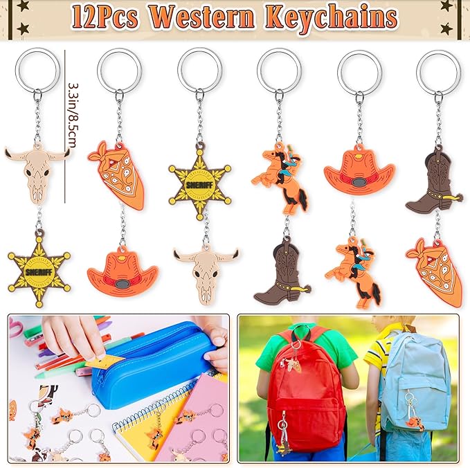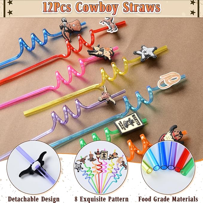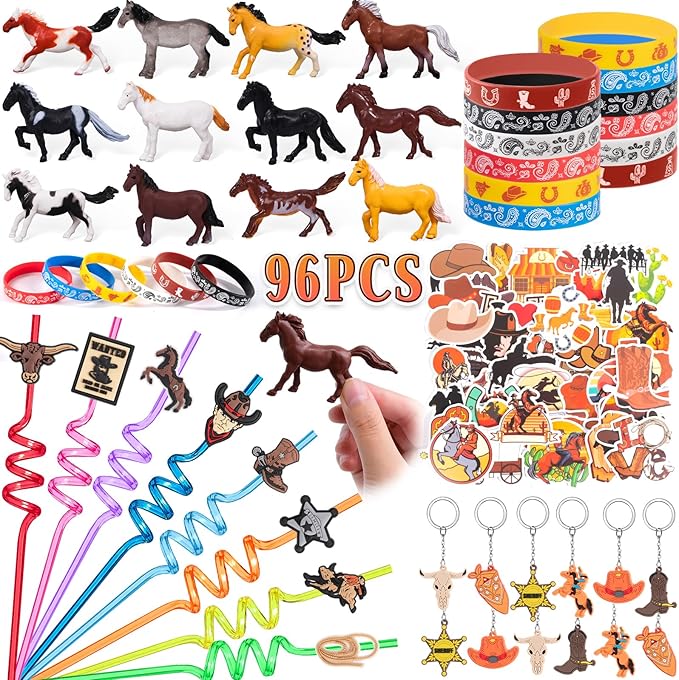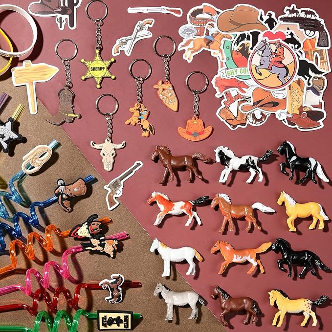 - PERFECT COWBOY PARTY FAVORS - Welcome to the world of western cowboy and create an unparalleled cowboy boy party for your little man! This set includes 12 miniature horse toys (12 styles), 12 cowboy straws (8 styles), 12 western keychains (6 styles), 12 silicone bracelets (6 styles), and 50 western stickers. Boys can use horse toys for pony play and rodeo games at parties. This is a best cowboy party option, enough for the kids to have fun at the party.