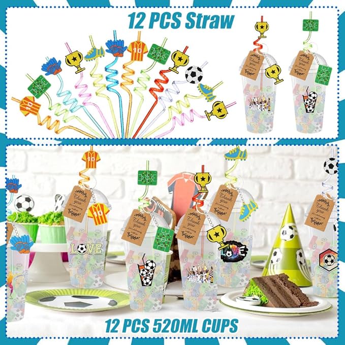 - 12 Set in Pack - A full package for 12 people, includes 12 cups with 12 covers, 12 straws,12 whistles, 12 bracelets, 12 keychains, 50 random stickers, 12 model balls, 12 tattoo stickers, 12 thank you tags with 12 twist ties, totally meet your party needs.