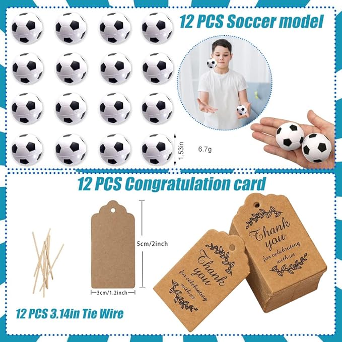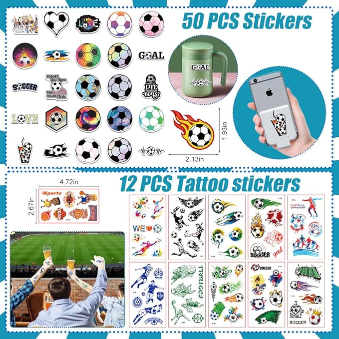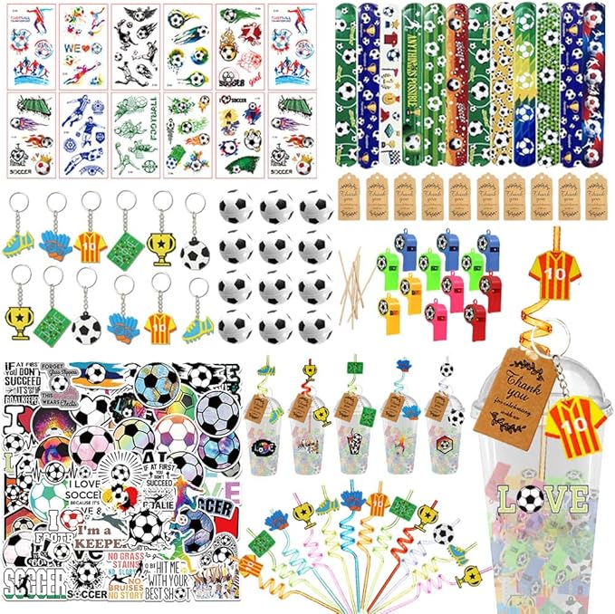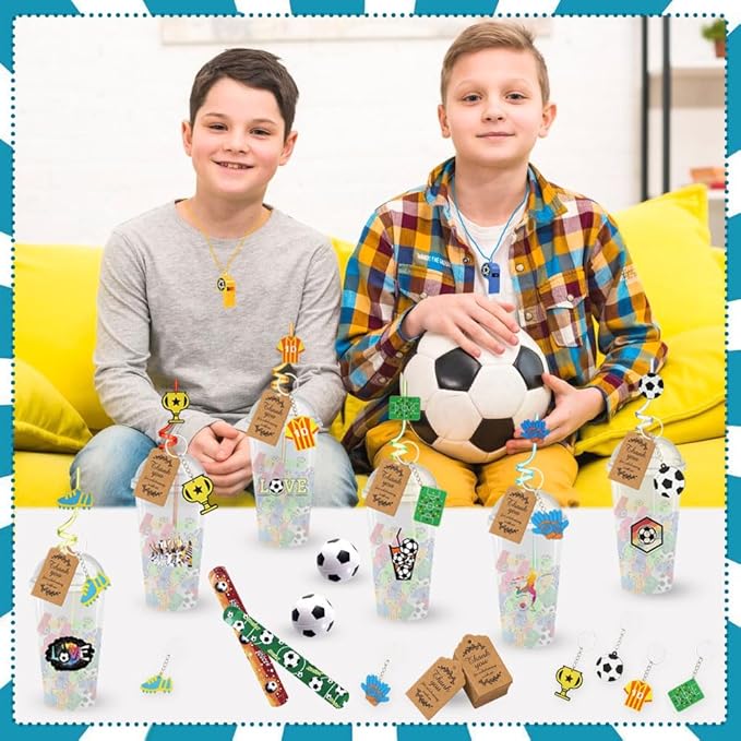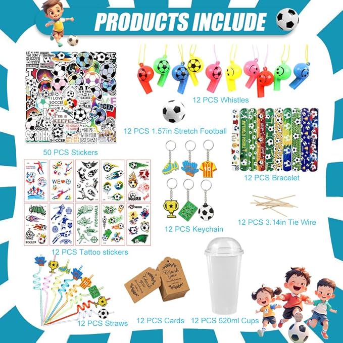 - Reusable and Durable - the Soccer stuffers are quality made, mini Soccers are made of PU, Soccer themed stickers are made of PVC, straws, and whistles are made of ABS plastic; The plastic cup is made of PP, and the thank you tag is made of kraft paper, which is all durable and safe to use, not easy to fade or break which you can use a long time even after the party.