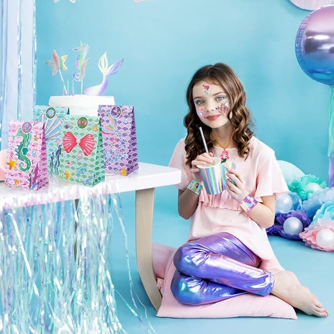 - Deluxe mermaid birthday party gift: Package includes 96pcs with 8 style favors served for 12 kids! 12 mermaid gift paper bags(4 style), 12 Sheets mermaid luminous temporary tattoos (6 style), 12 3D little mermaid necklace(10 styles), 12 adjustable shine mermaid jewelry rings (6 styles), 12 mermaid hair clips(5 style), 12 mermaid slap bracelets, 12 mermaid tail Keychain, 12pcs mermaid stampers. Let the girls shine at the party with our mermaid party favors