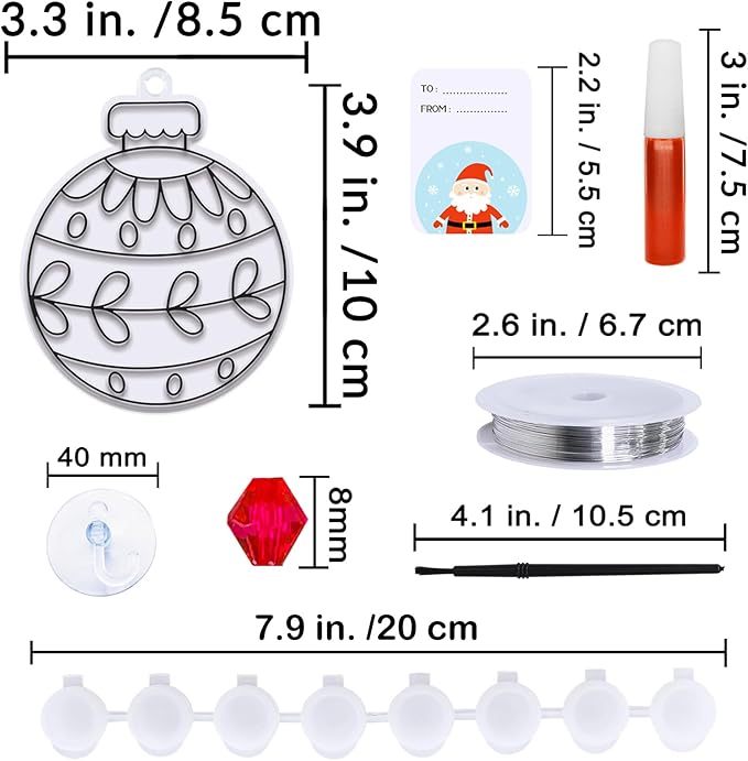 • Quantity: 30 sets Christmas bauble suncatchers DIY window paint art suncatchers Christmas craft kits include 30 Christmas bauble sun catchers in 10 designs, each design has 3 pcs, 20 bottles of suncatcher paint in 9 festive colors (6ml per bottle), 1 strip of 8 empty paint pots, 30 paintbrushes, 360 acrylic beads, 590" roll of fishing thread, 30 suction hooks, 30 gift stickers. Each suncatcher has a hole at the top for easy hanging. Perfect for kids and adults to enjoy festive arts and crafts!