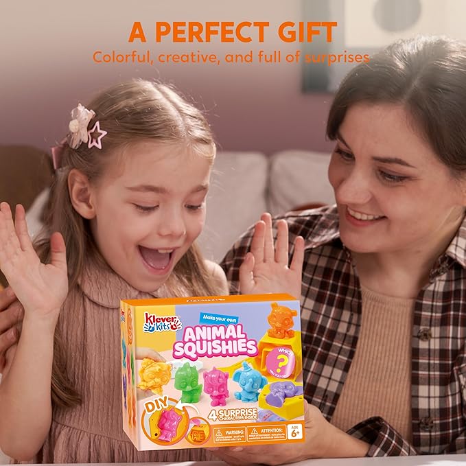 Klever Kits DIY Animal Squishies Kit, Mystery Box with 4 Surprise Characters Inside, Arts and Crafts, Squishy Toys for Kids Ages 6+