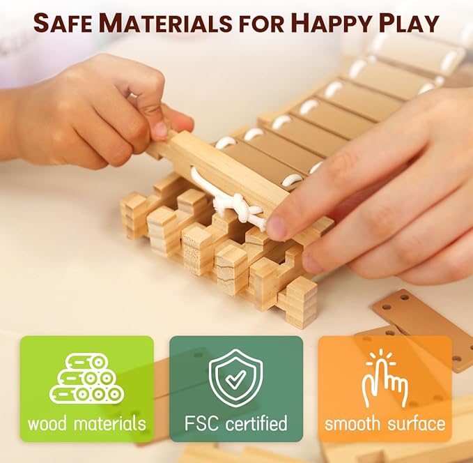 - Safe Materials, Loved by Kids: Jovi-mindly wood blocks are made from non-toxic, eco-friendly wood to ensure a safe play environment for children, with peace of mind for parents. The blocks for kids ages 4-8 are free from glue or harmful chemicals and come with a convenient, easy-to-clean storage bag. Each piece is thoughtfully designed with a smooth surface, easy to grip and assemble, and the size of wooden building blocks is perfect for small hands.